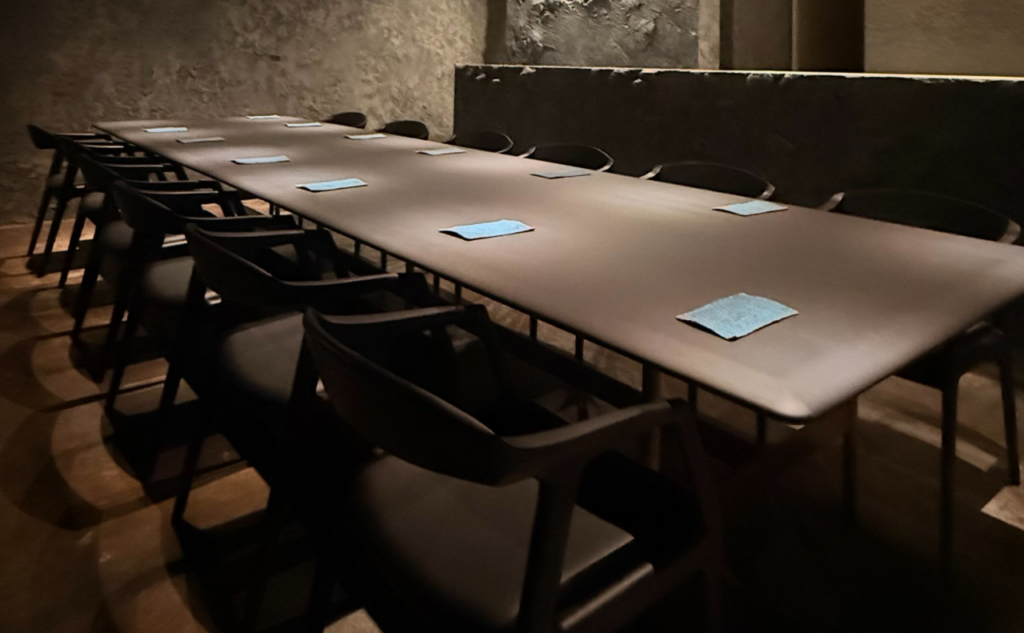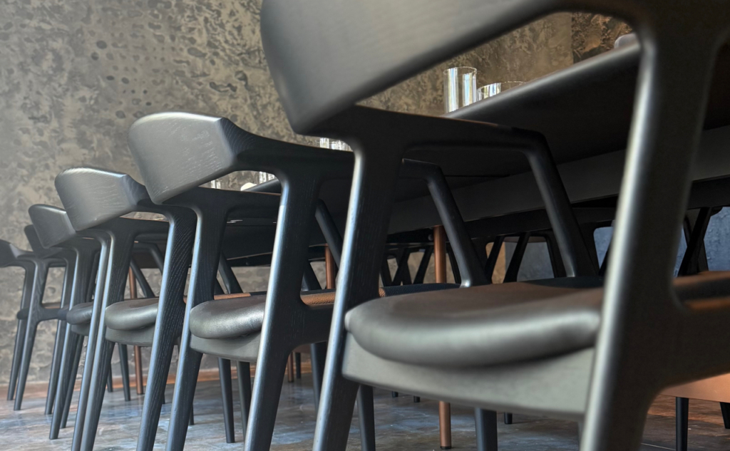 磨き込まれたようなブラックの陰影は、テーブルに並ぶ料理の色彩やワイングラスのきらめきを一層引き立て、レストラン全体の世界観を静かに支えてくれそう。手が触れた瞬間の滑らかさや、光によって変化する木目の表情が、ゲストに“本物の質感”を感じさせ、心地よい緊張感と落ち着きを同時にもたらしてくれるはずです。